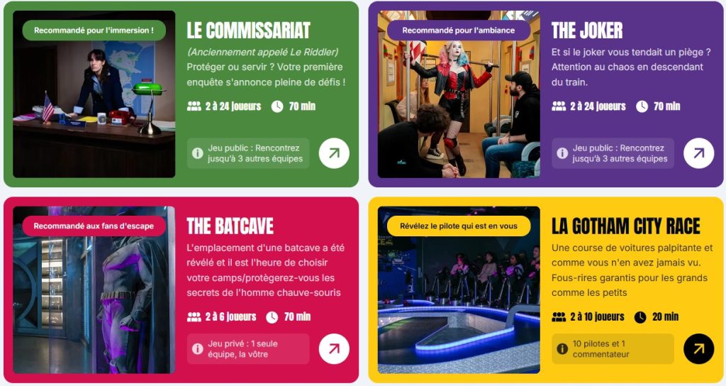 Dans l’ombre, Batman Escape surgit pour vous faire découvrir le plus grand escape game de France en plein cœur de Paris (La Villette). 3000m2 dédié à l’univers du Chevalier Noir où vous retrouverez 3 expériences de jeu de plus de 600m2 où des comédiens sont partis prenantes de l’expérience, un bar immersif en plein cœur de Gotham City et la 1ère boutique souvenir DC Comics avec des produits inédits.
